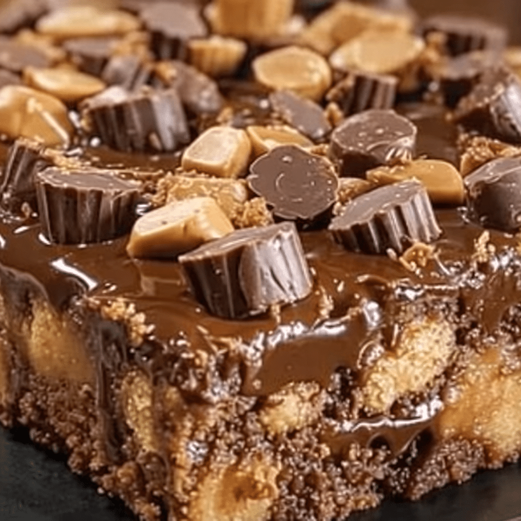 This recipe is incredibly easy to make—no complicated steps, no fancy equipment. Just layer the ingredients, bake, and enjoy a rich, gooey cake packed with melted chocolate, creamy peanut butter, and chunks of peanut butter cups in every bite.