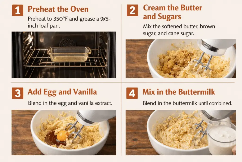 In a large mixing bowl, combine 1/2 cup softened butter, 1/2 cup brown sugar, and 1/2 cup white cane sugar. Using a hand mixer or stand mixer on medium speed, beat for 2–3 minutes. The mixture should become light, fluffy, and slightly pale in color. Proper creaming incorporates air, which helps create a soft and tender loaf.