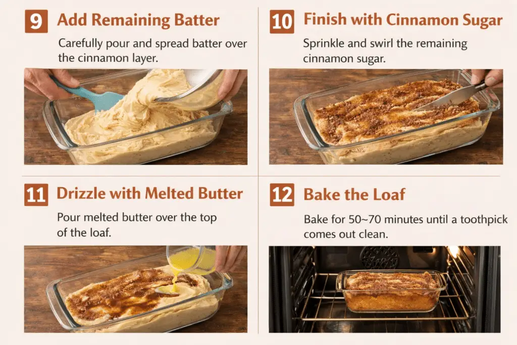 Sprinkle half of the cinnamon sugar mixture evenly over the batter in the loaf pan. Using a butter knife, gently swirl the cinnamon into the batter with side-to-side and up-and-down motions. Avoid overmixing—you want visible ribbons of cinnamon, not fully blended batter.