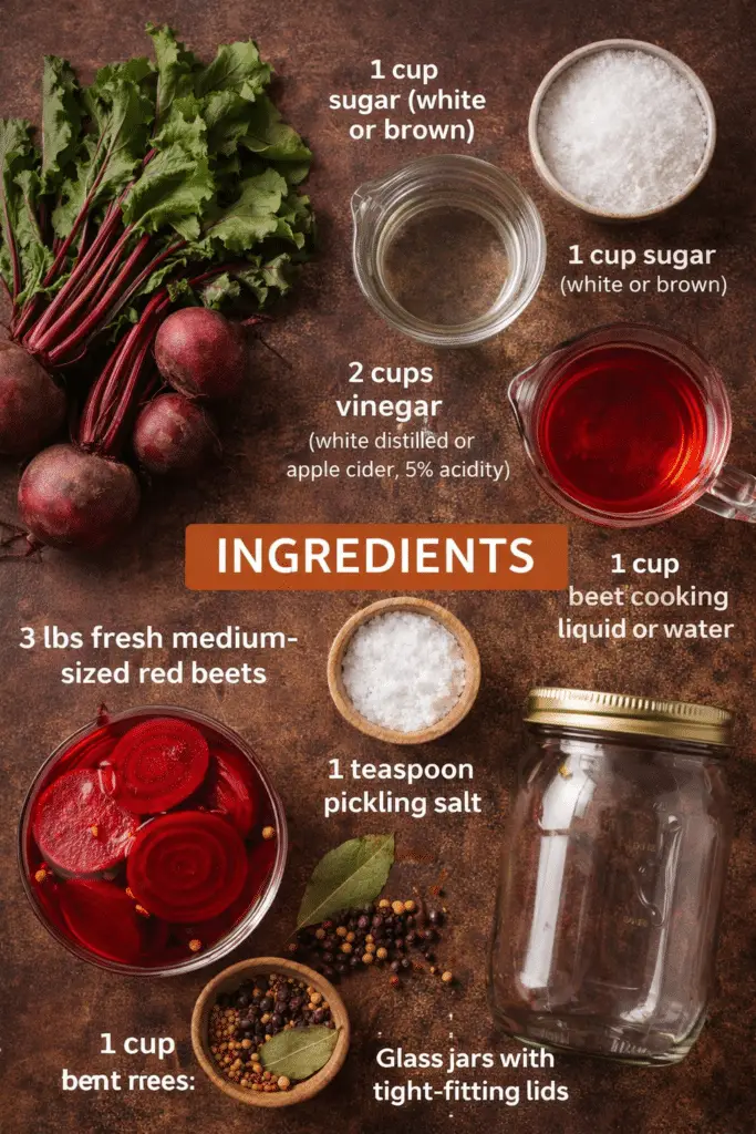 • 2 cups vinegar (white distilled or apple cider, 5% acidity) – Provides the essential tang and preserves the beets safely.