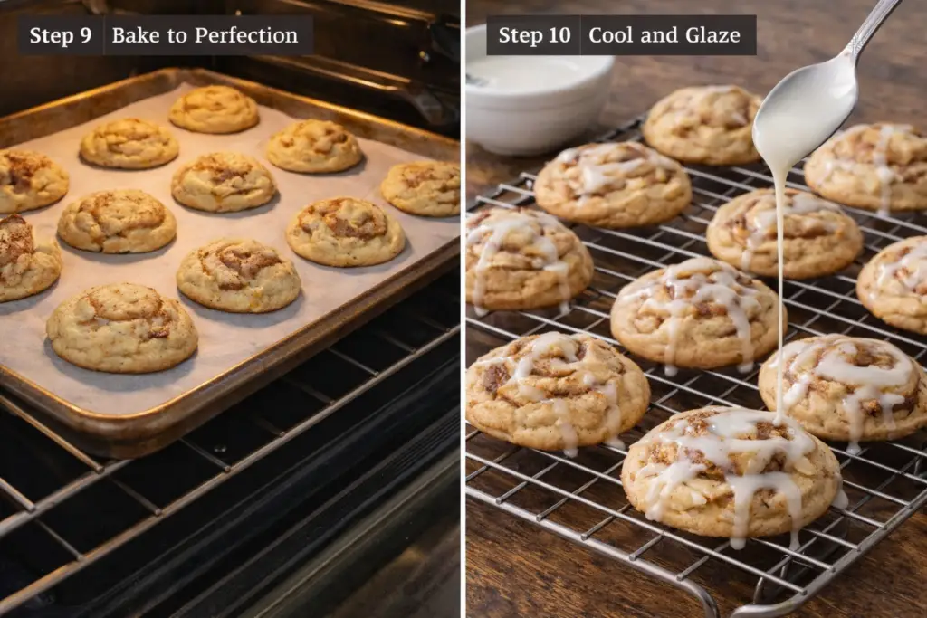 If desired, whisk together 1 cup powdered sugar (optional), 2–3 tbsp milk (optional), and ½ tsp vanilla (optional) until smooth. Drizzle over completely cooled cookies for a classic cinnamon roll finish.