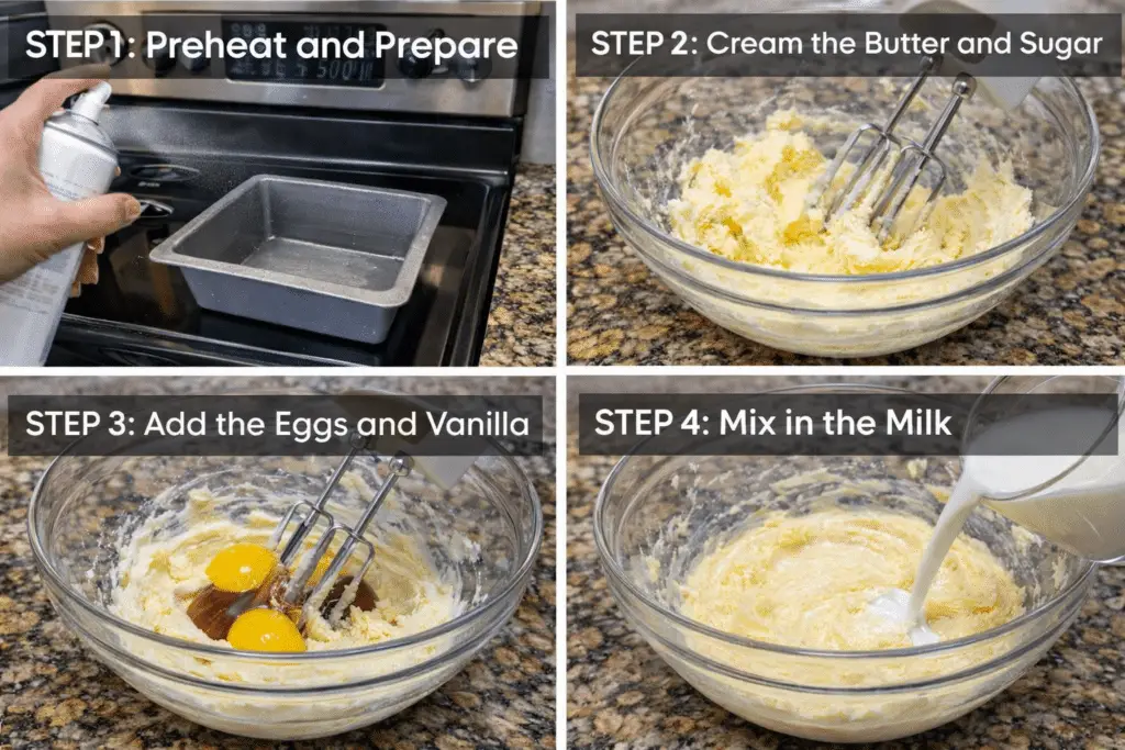 Slowly pour in the whole milk while mixing on low speed. The batter may look slightly loose at this stage, which is perfectly normal. The milk ensures moisture and contributes to the soft crumb once baked.