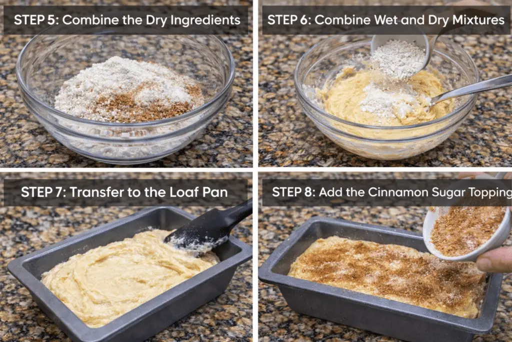 Place the loaf in the center of the oven and bake for 50–60 minutes. Around the 50-minute mark, check for doneness by inserting a toothpick into the center. If it comes out clean or with a few moist crumbs, it’s ready. The top should be golden brown with a crackly cinnamon crust.