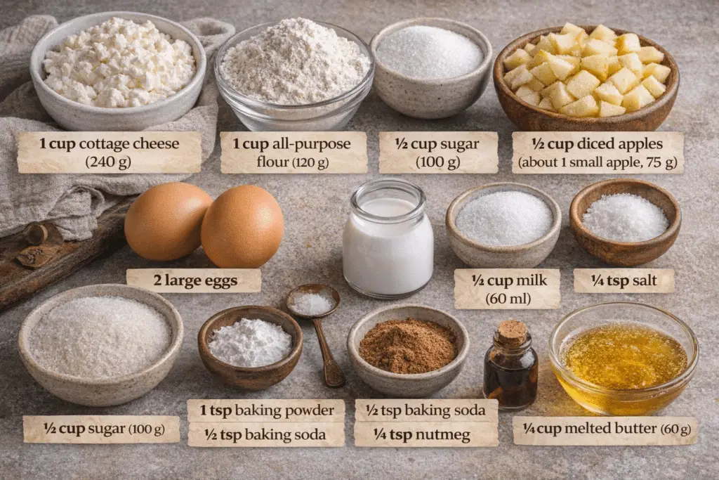 • 1 cup cottage cheese (240 g) – Adds moisture and protein for a tender texture.