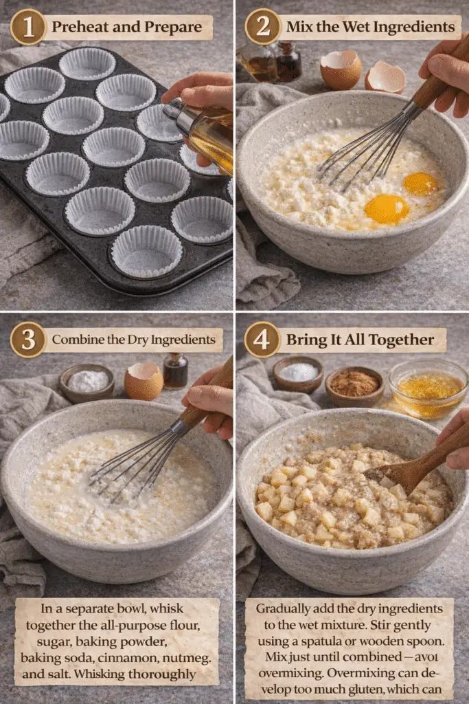 Gradually add the dry ingredients to the wet mixture. Stir gently using a spatula or wooden spoon. Mix just until combined—avoid overmixing. Overmixing can develop too much gluten, which can lead to dense or tough muffins.