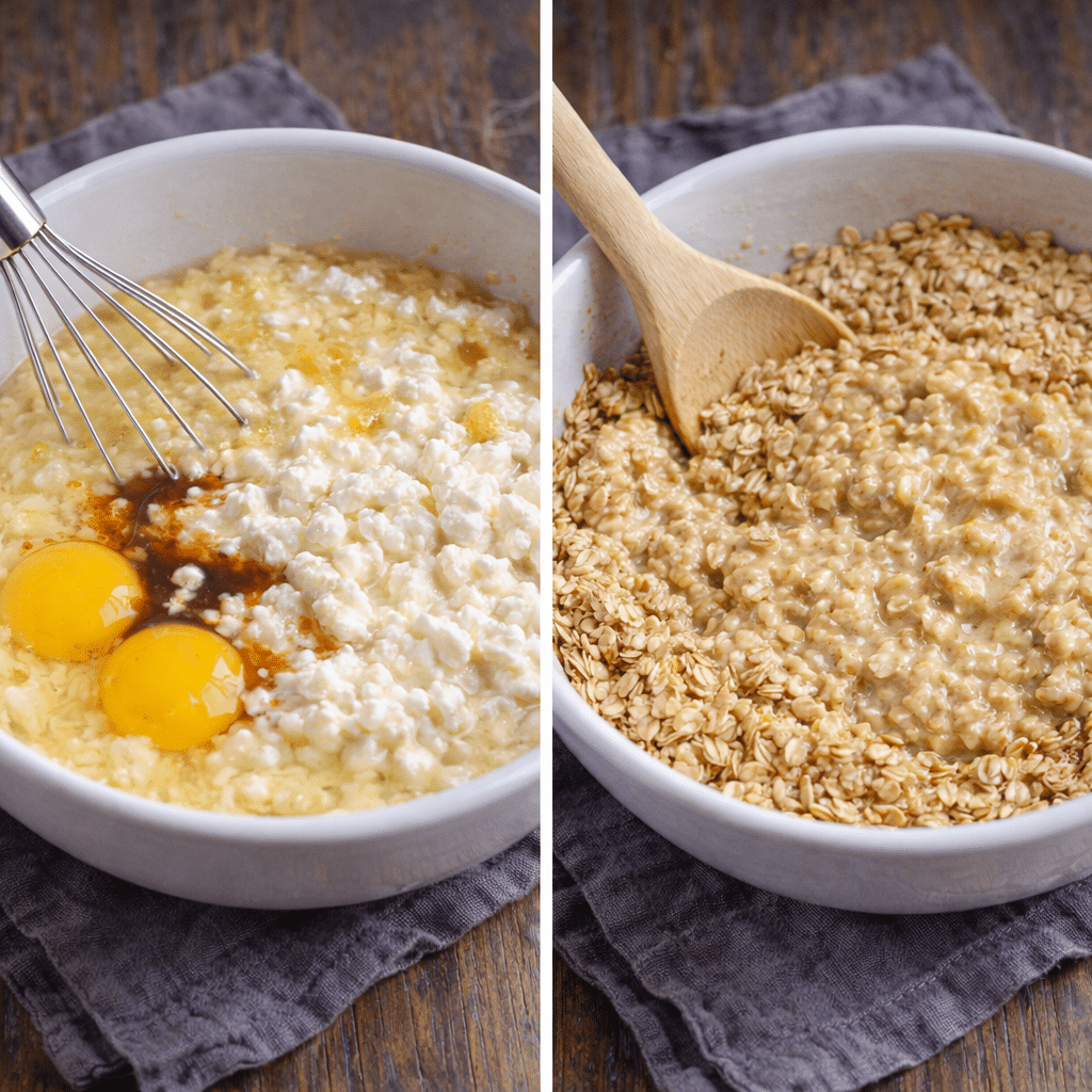 2. In a separate bowl, mash the banana until smooth. Add cottage cheese, eggs, and vanilla extract. Whisk until creamy.