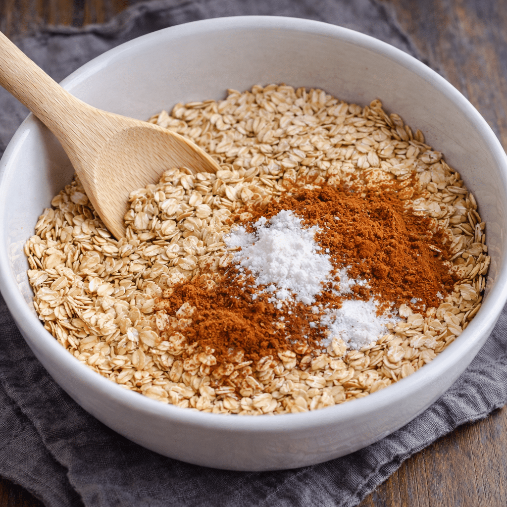 Start by selecting a large mixing bowl to give yourself plenty of space for stirring. Add the 1 cup rolled oats, 1/2 tsp ground cinnamon, 1/2 tsp baking powder, and a pinch of salt.