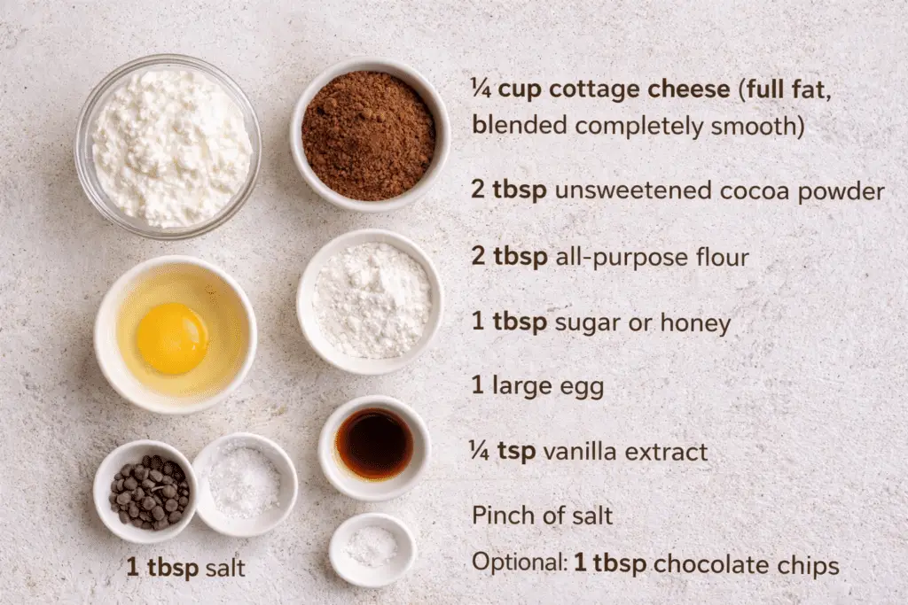 • ½ cup cottage cheese (full fat, blended completely smooth) – Creates a creamy, protein-rich base that keeps the brownie moist and fudgy.