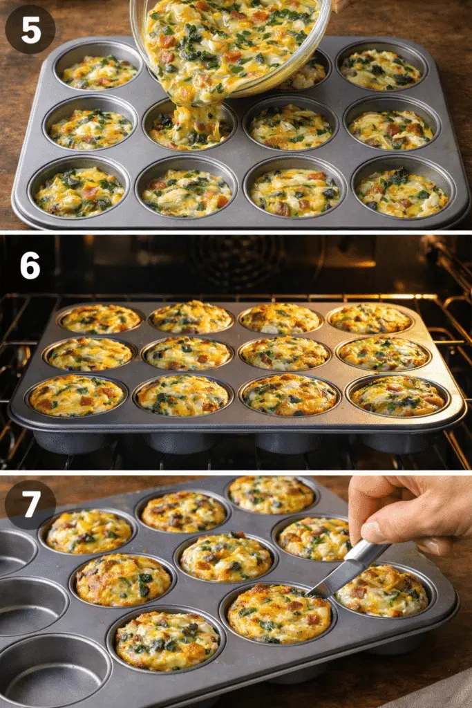 Place the muffin tin on the center rack of the oven and bake for 18–22 minutes. The muffins are done when the centers are set and no longer jiggly. The tops should look lightly golden and slightly puffed. You can insert a toothpick into the center — if it comes out clean, they’re ready.