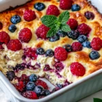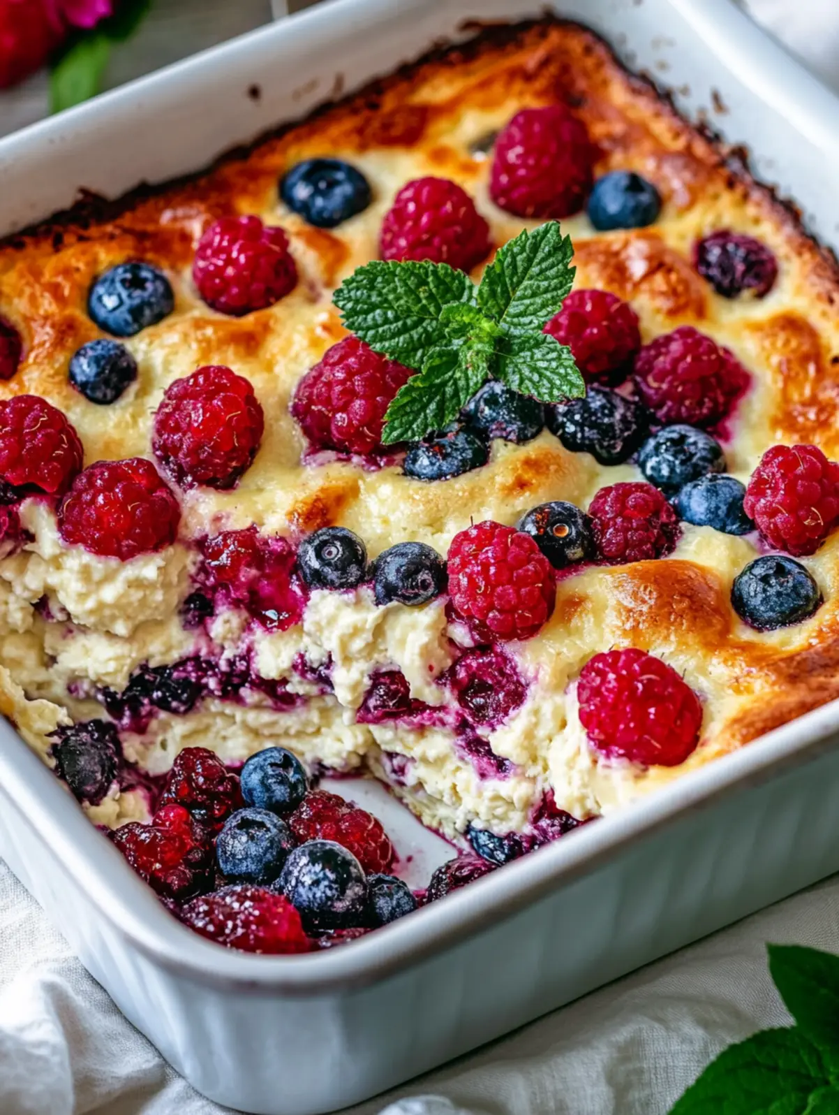 These protein-rich Triple Berry Bake transforms morning meals with its cloud-like texture and bursts of sweet-tart berries in every bite. The secret lies in the cottage cheese base, creating a perfectly balanced breakfast that’s both satisfying and nutritious. Golden on top with a custardy center, this baked breakfast delivers impressive protein content while feeling indulgent enough for weekend brunch — complete with a subtle hint of lemon zest that brightens the mixed berries beautifully.