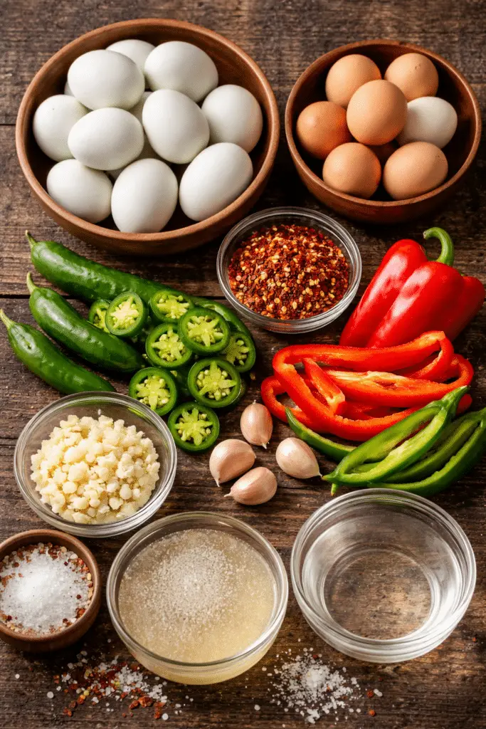 2. In a clean, sterilized jar, layer the peeled eggs with sliced jalapeños, sweet red pepper, and minced garlic.