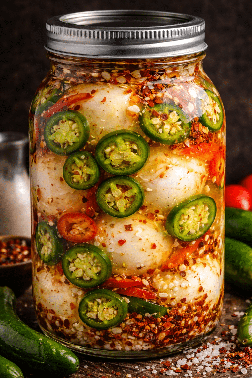 This waiting period allows the garlic, peppers, and vinegar to deeply penetrate the eggs. The flavor intensifies over time, so patience truly pays off.