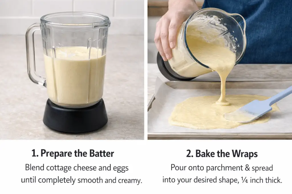 You’re looking for a silky, lump-free consistency. Cottage cheese curds must fully break down so the batter bakes into an even, flexible sheet rather than a textured or uneven wrap. The smoother the batter, the more uniform and foldable your wraps will be.