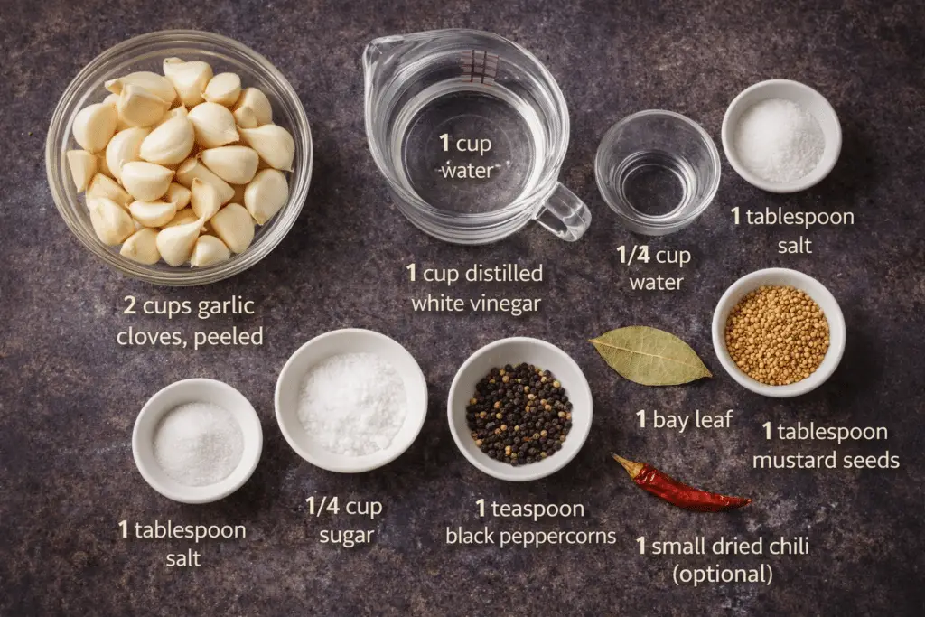 • 2 cups garlic cloves, peeled – The star of the recipe, offering bold flavor that mellows beautifully when pickled.