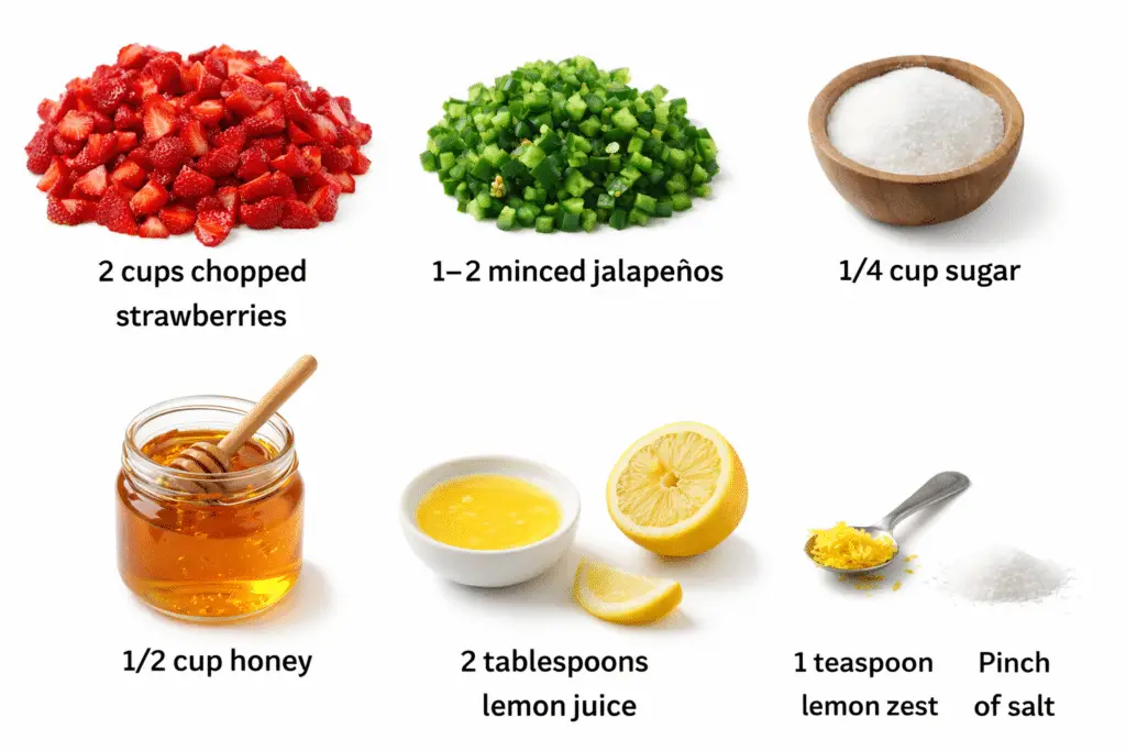 Place a medium saucepan on your stovetop. Add the 2 cups chopped strawberries, 1–2 minced jalapeños, 1/2 cup honey, 1/4 cup sugar, 2 tablespoons lemon juice, 1 teaspoon lemon zest, and a pinch of salt directly into the pan.