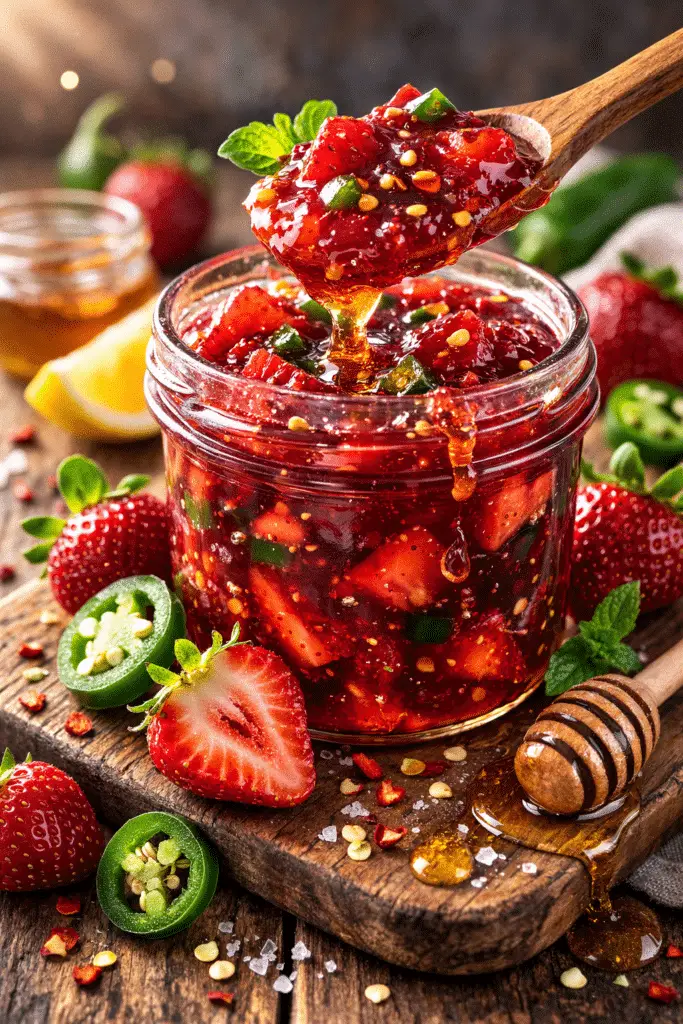 A sweet and spicy homemade jam bursting with fresh strawberries, honeyed depth, and a gentle jalapeño kick. Perfect for toast, cheese boards, or glazing savory dishes.