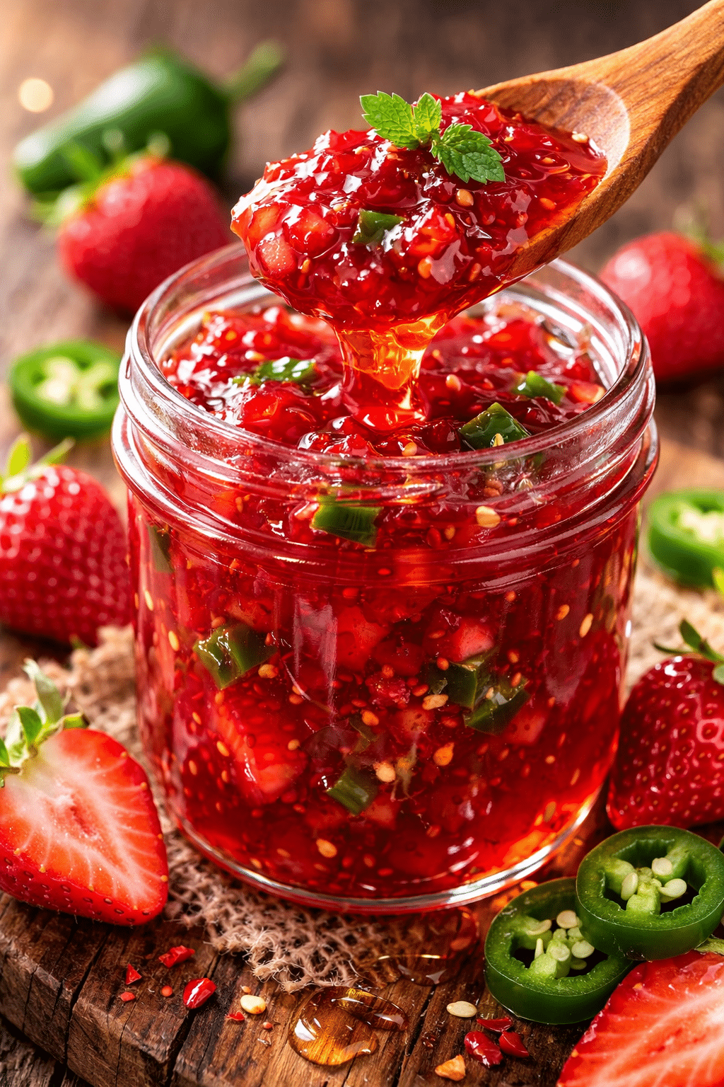 A sweet and spicy homemade jam bursting with fresh strawberries, honeyed depth, and a gentle jalapeño kick. Perfect for toast, cheese boards, or glazing savory dishes.
